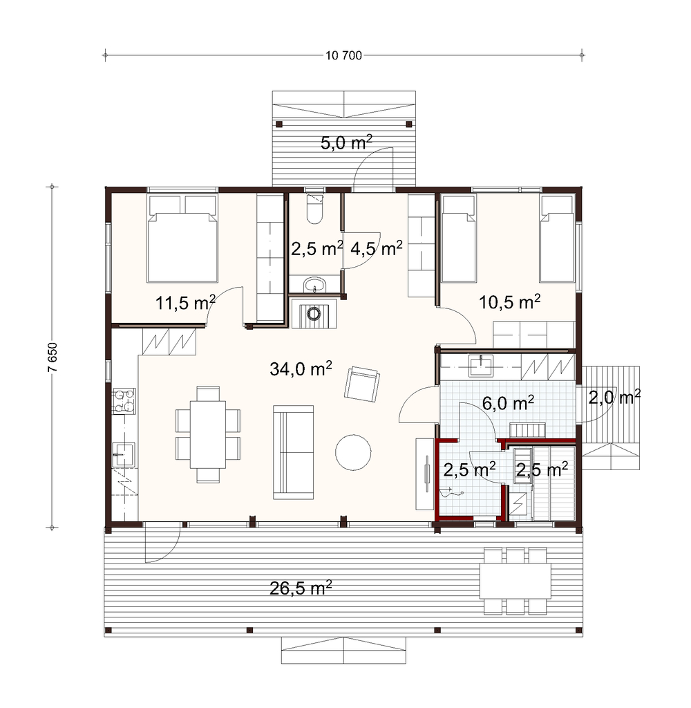 Sirius is one of our most popular holiday homes, and we have just introduced an updated version of the version of the model with an area of 82 m2. Honka Sirius model has been a steadfast favourite for many years thanks to its expansive windows and large sheltered terrace. The interior design is as functional and comfortable as anyone could wish for, taking in the precious sunlight and the surrounding natural landscape.