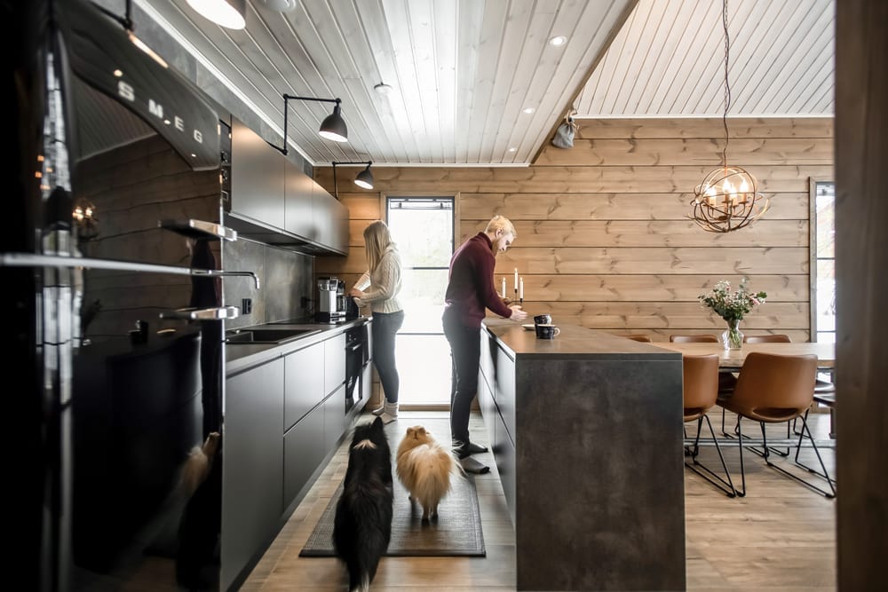 It all started with a perfect plot of land. Surrounded by tourists, their earlier log cabin in Ruka no longer felt comfortable, and the dream of a new log cabin in a quieter place seemed attractive. Ellinor’s parents found a hillside plot in Äkäslompolo, where the sun shines in the evening. Everything was perfect about it – the quiet location, orientation and elevation. Although building on a hillside has its challenges, the project proceeded apace. Ellinor’s training in construction came in handy, and is reflected in the log cabin’s interior. The atmospheric, dark interior helps you to relax, while the picture is completed by glazing bar windows that offer a view of the forest.