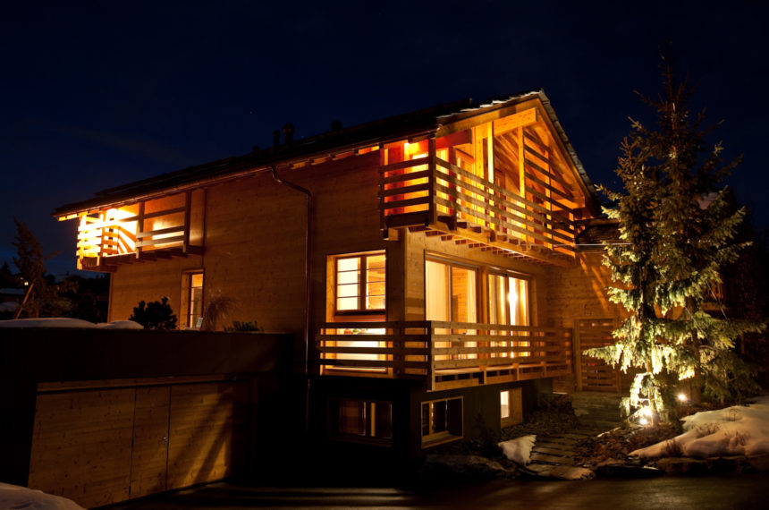 The Swiss Alpine chalet is located in a very sunny place and with the combination of stone, glass and logs creates a natural ”heating system”. The wood stores the sun’s heat and releases it into the rooms. Due to the large window surfaces, the warmth of the sun can be utilised to its full extent to heat the house. The rest of the heating is managed through ground heating.