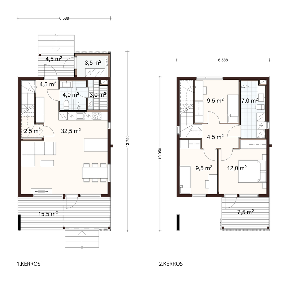 The stunning Frida is a perfect fit for the urban environment. The cosy ground floor houses the bathroom and sauna as well as a spacious kitchen-living room with large windows overlooking the patio. The bedrooms and second bathroom are upstairs. The master bedroom has access to a balcony. Frida’s log façade is surrounded by slat fencing that provides some privacy both on the backyard patio and the balcony.