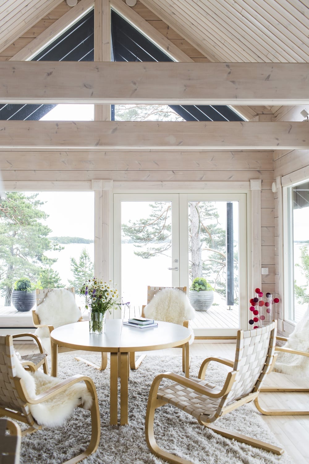 The beautiful translucent matt surface of the indoor walls was created using white Supi Saunavaha (Sauna Wax) by Tikkurila, which leaves the rains and knots of the pine visible. The floors were finished with the shade 5062 Birchbark of Parketti-Ässä stain by Tikkurila in order to create a contrast with the light walls and ceiling.
