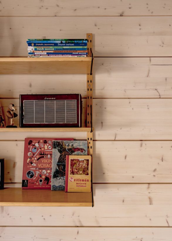 The interior is characterised by an abundance of wood. The logs have been left as natural-looking as possible and treated with a light shade. Anne and Janne selected ash parquet as the flooring, and the countertop in the dark-grey kitchen is also made of ash. The couple made the functionalism-inspired ash pulls in the kitchen themselves. They add a lovely 60s feel to the space. When decorating their home, Anne and Janne like to combine the styles of the 50s, 60s and 70s with modern items.