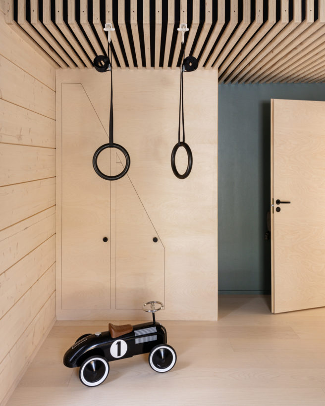 The sauna and technical facility were omitted from the designs, and the space allocated for them was used for a children’s room and utility room instead. A bit more space was created in the children’s room by building a loft. It offers room for lounging and gives the room a fun look. The loft can be accessed via steps inside a wardrobe, so the family named the hideout “Narnia” after C.S. Lewis’ famous children’s books.